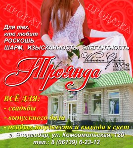 Цены бешеные, учитывая что далеко не все жители Энергодара работают на атомной, в "Троянде" цена самого дешевого свадебного платья равна цене самого дорого в свадебном салоне г.Днепрорудный, туда не то что дорога окупится, а вообще можно на пару платьев прихватить!!!