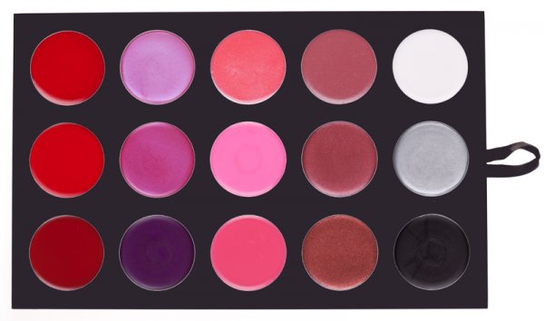Планшетка состоит из 15 помад и блесков для губ.