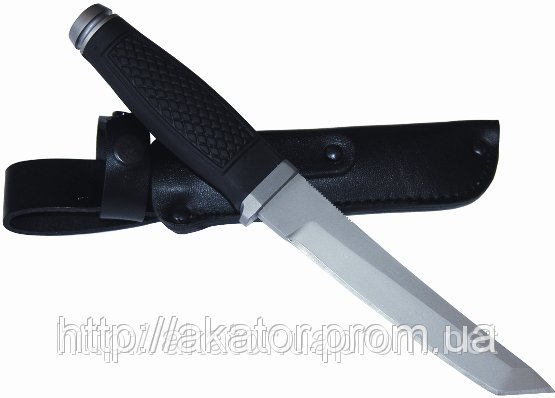 Нож «Самурай» создан в популярном стиле «танто». Рукоятка выполнена из практичного и стойкого термоэластопласта. Затыльник ножа плоский, что позволяет использовать его в качестве молотка. Комплектуется ножнами из кожи.