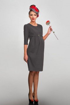 Платье, ткань костюмная, серого цвета, с полукруглым вырезом горловины, рукавом три четверти, деликатной драпировкой и брошью серебряного цвета под грудью, длина до колен.