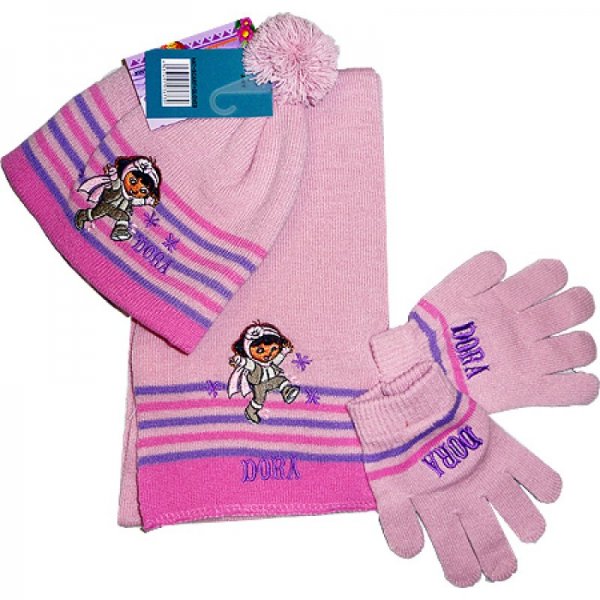 Набор (комплект) детский для девочек: шарф, шапка и перчатки, розового цвета, теплый качественный фирменный. Рисунки и изображения на вещах комплекта из популярного детского познавательного сериала "Даша следопыт" (Dora), который вот уже несколько лет радует наших малышей на канале "Nickelodeon" (Никельодеон).