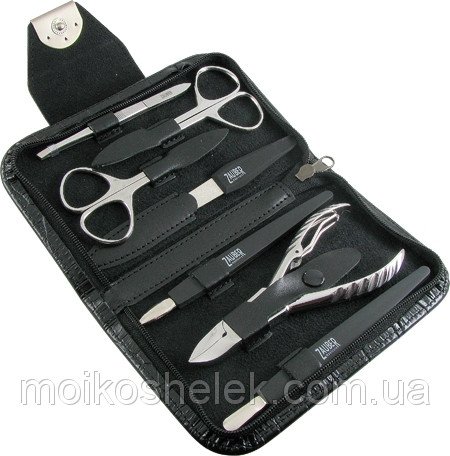 Vilna-kasa - Маникюрный набор мужской Zauber MS 111, 7 предметов, страна производитель Германия. Футляр в виде кошелька на змейке. Цвет футляра: черный. Внешняя отделка футляра – кожа, внутренняя отделка – велюр под замшу. Упаковывается в коробку из картона. Материал инструментов: высококачественная нержавеющая сталь.